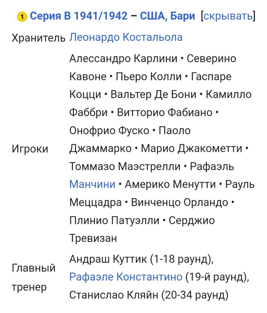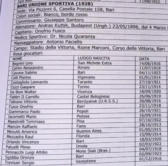 Бари 1941-1942 гг. Они изображены стоящими слева: массажист Пачелло, лейтенант, близкий к команде, Менутти, Меццадра, Фуско, Фаббри II, Перуччи (дядя Костальолы), Тревизан, Патуэлли, Эдмондо Фаббри (гость), Де Бони и тренер. Кляйн. Приседают (всегда слева): Манчини, Карлини, Костальола, Джаммарко.