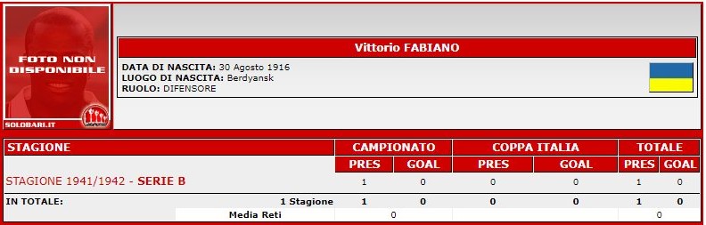 К сожалению, в интернете ни так много можно найти информации тех лет о команде «Бари» или ее игроках. Известно лишь, что Витторио Фабиано родился 30/08/1916 года в Бердянске, Украина. Что он провел лишь одну игру в составе команды сезона 1941/42 года, в котором команда Unione Sportiva Bari стала чемпионом серии «В» по футболу в Италии и получила право выступать в следующем сезоне в серии «А».
